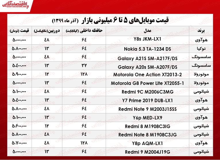 به گزارش نبض بازار؛ قیمت انواع گوشی موبایل در محدوده ۶میلیون تومان را گرد آورده ایم. آنچه در زیر میآید قیمت انواع موبایل ۵تا ۶میلیون تومانی در سطح بازار تهران است.