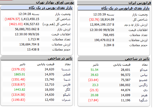در ساعت 12:30 شاخص کل بورس پس از افت 31860 واحدی (3 درصد) به 1,413,024.0  و سقوط شاخص کل همگن 2.3 درصد کاهش یافت.