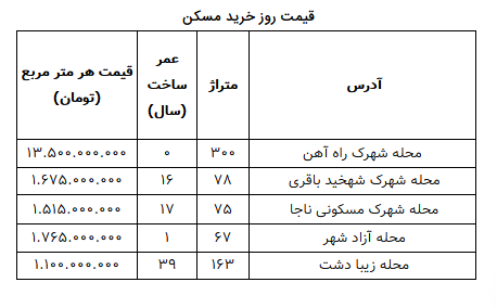 قیمت یک واحد مسکونی در محله شهر راه اهن با متراژ 300 و تازه ساخت 13 میلیارد و 500 میلیون تومان معامله می شود. توجه داشته باشید تمامی قیمت ها براساس معامله یک ماه اخیر جمع آوری شده است و ممکن است تغییراتی داشته باشد و قیمت های در متر مربع متفاوت باشد بنابراین نبض بازار دخل و تصرفی در قیمت ها ندارد.