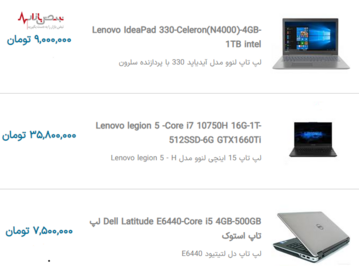 به گزارش نبض بازار ،قیمت خرید لپ تاپ بسته به قابلیت ها، برند، نوع لپ تاپ و سایر قابلیتهای آن میتواند متفاوت باشد. در حال حاضر قیمت لپ تاپ از حدود ۱۰ میلیون تومان شروع شده و با توجه به قابلیتهای لپ تاپ افزایش مییابد.