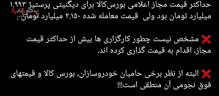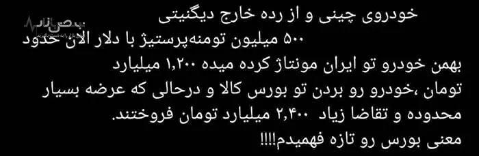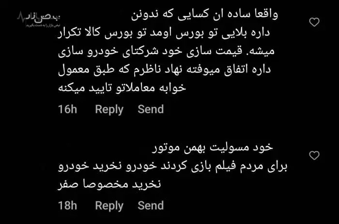 در ادامه میتوانید برخی از این کامنتها را مشاهده کنید که در آنها، کاربران میگویند بهمن موتور با دو روش عرضهی کم و همچنین ایجاد تقاضای کاذب موجب افزایش قیمت این خودرو به بالای ۲ میلیارد تومان شده تا با این حربه بتواند قیمت دیگنیتی پرستیژ را در کارخانه و بازار آزاد نیز افزایش دهد.