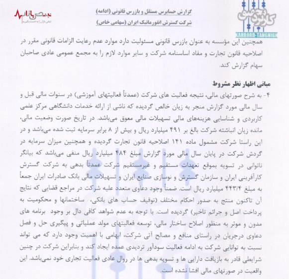 در تاریخ صورت وضعیت مالی، مانده زیان انباشته شرکت فوق حدودا ۵۰ میلیارد تومان میباشد و بیش از ۸ برابر سرمایه ثبت شده میباشد و در این راستا شرکت مشمول ماده ۱۴۱ اصلاحیه قانون تجارت گردیده و همچنین میزان سرمایه در گردش این شرکت در پایان سال مالی مورد گزارش مبلغ ۴۸ میلیارد تومان منفی میباشد که بیانگر ناتوانی در تسویه بموقع تعهدات مستقیم و غیرمستقیم شرکت عمدتا بدهی به شرکت گسترش کارآفرینی ایران و سازمان گسترش و نوسازی صنایع ایران و تسهیلات مالی بانک صادرات ایران جمعا به مبلغ ۴۴ میلیارد تومان است.
