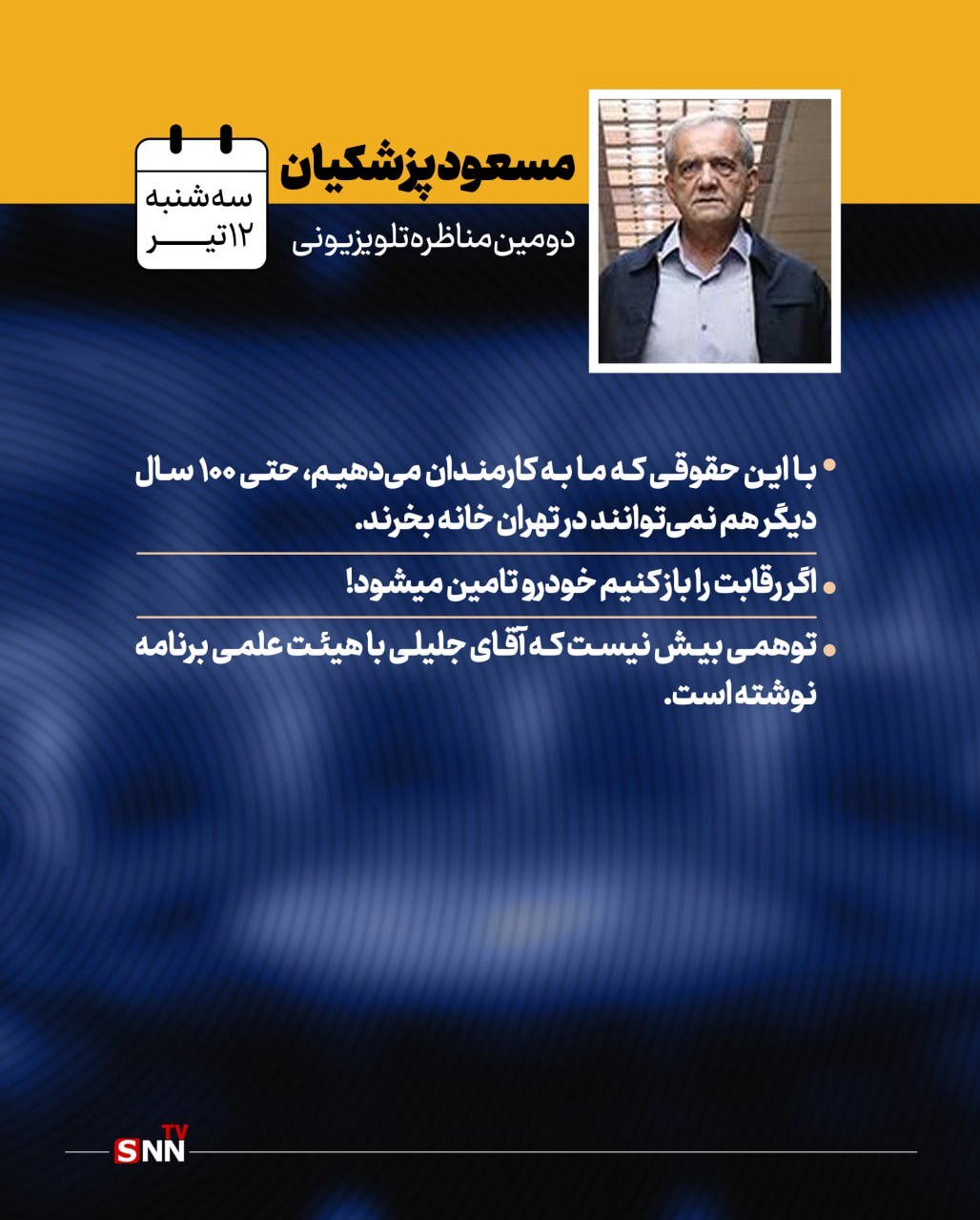 به گزارش نبض بازار، تصاویری از خلاصه صحبتهای کاندیدهای ریاست جمهوری در دومین و آخرین مناظره دور دوم انتخابات منتشر شد.