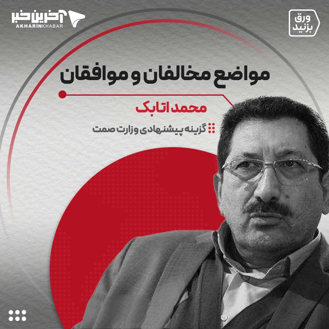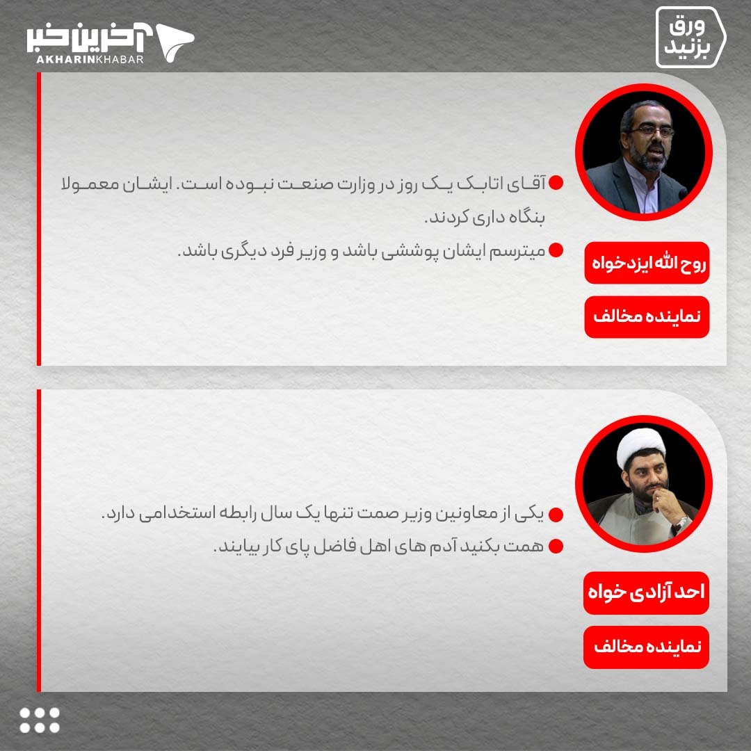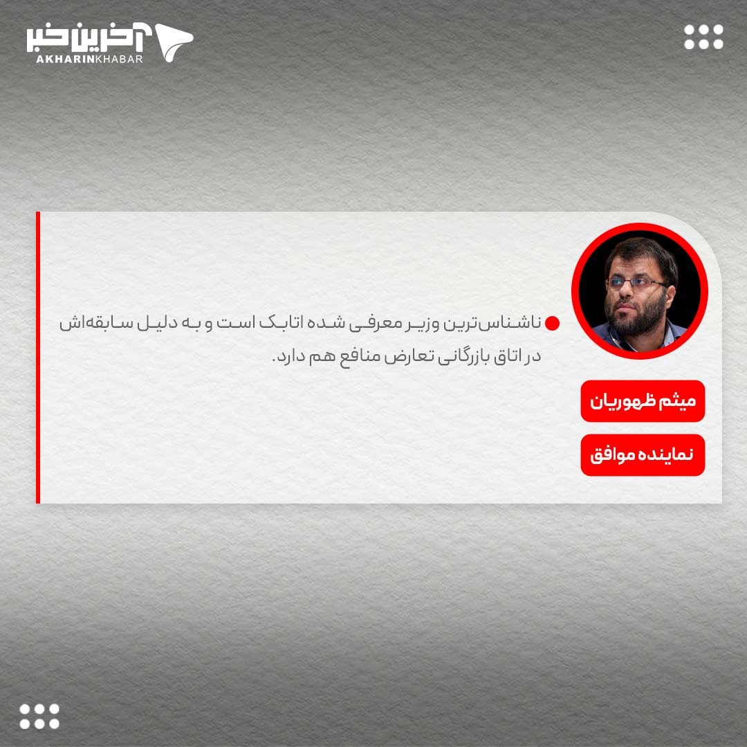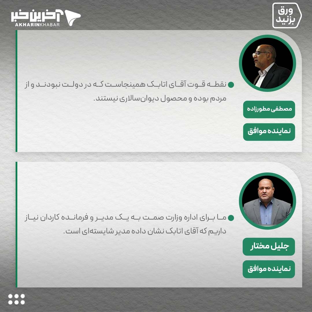 مواضع مخالفان و موافقان اتابک گزینه پیشنهادی وزارت صنعت، معدن و تجارت + تصاویر موافقان و مخالفان در مجلس درباره محمد اتابک چه گفتند؟ ۳۰ مرداد ۱۴۰۳ - ۱۲:۱۹