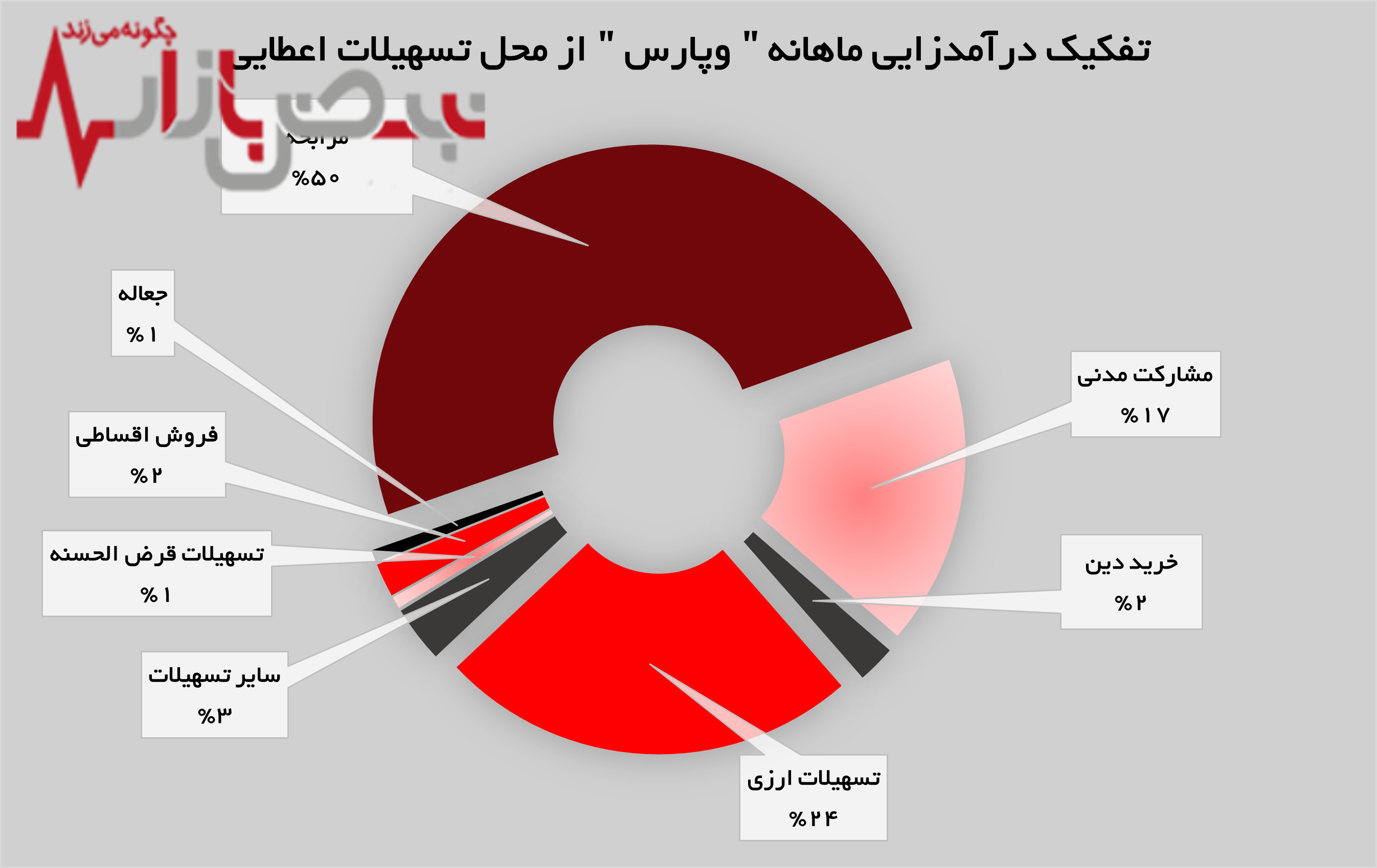 عمدهترین درآمد بانک پارسیان از محل تسهیلات اعطایی در فروردین ماه متعلق به «مرابحه» و مبلغ به ثبت رسیده در این بخش برابر با یک هزار و ۲۱۴ میلیارد تومان بود. درآمدی که "وپارس" از بخش «مرابحه» به همراه داشت ۵۰ درصد از کل درآمدهای شناساییشده از محل تسهیلات اعطایی در فروردین ماه را به خود اختصاص داد. از دیگر بخشهای درآمدزا از قسمت تسهیلات اعطایی میتوان به «تسهیلات ارزی» و «مشارکت مدنی» با ۵۹۳ و ۴۱۰ میلیارد تومان اشاره کرد. بخشهای نامبرده نیز به ترتیب ۲۴ و ۱۷ درصد از کل درآمد ماهانه از این بخش را در اختیار داشتهاند.