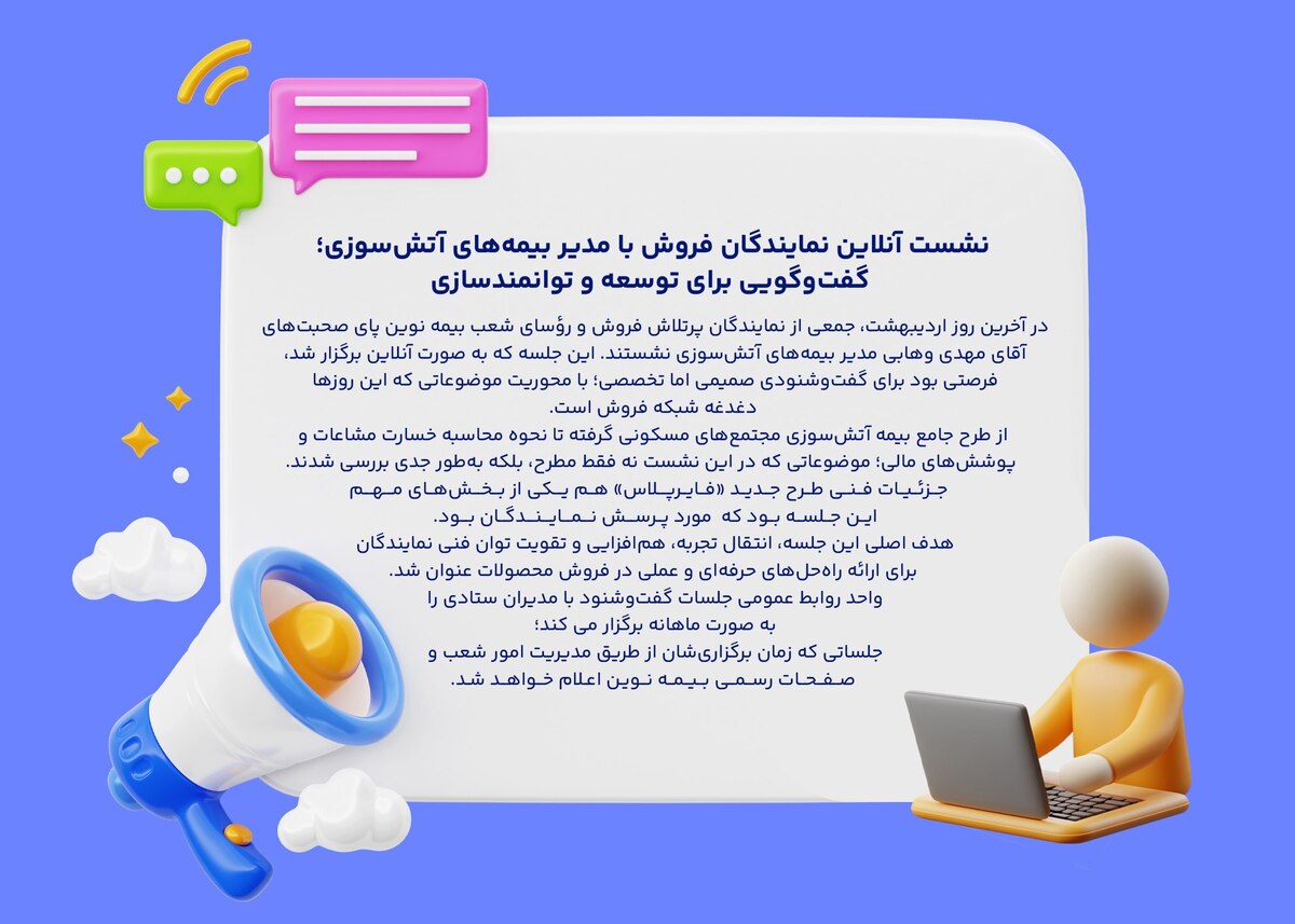 نشست آنلاین نمایندگان فروش بیمه نوین با مدیر بیمههای آتشسوزی؛ گفتوگویی برای توسعه و توانمندسازی