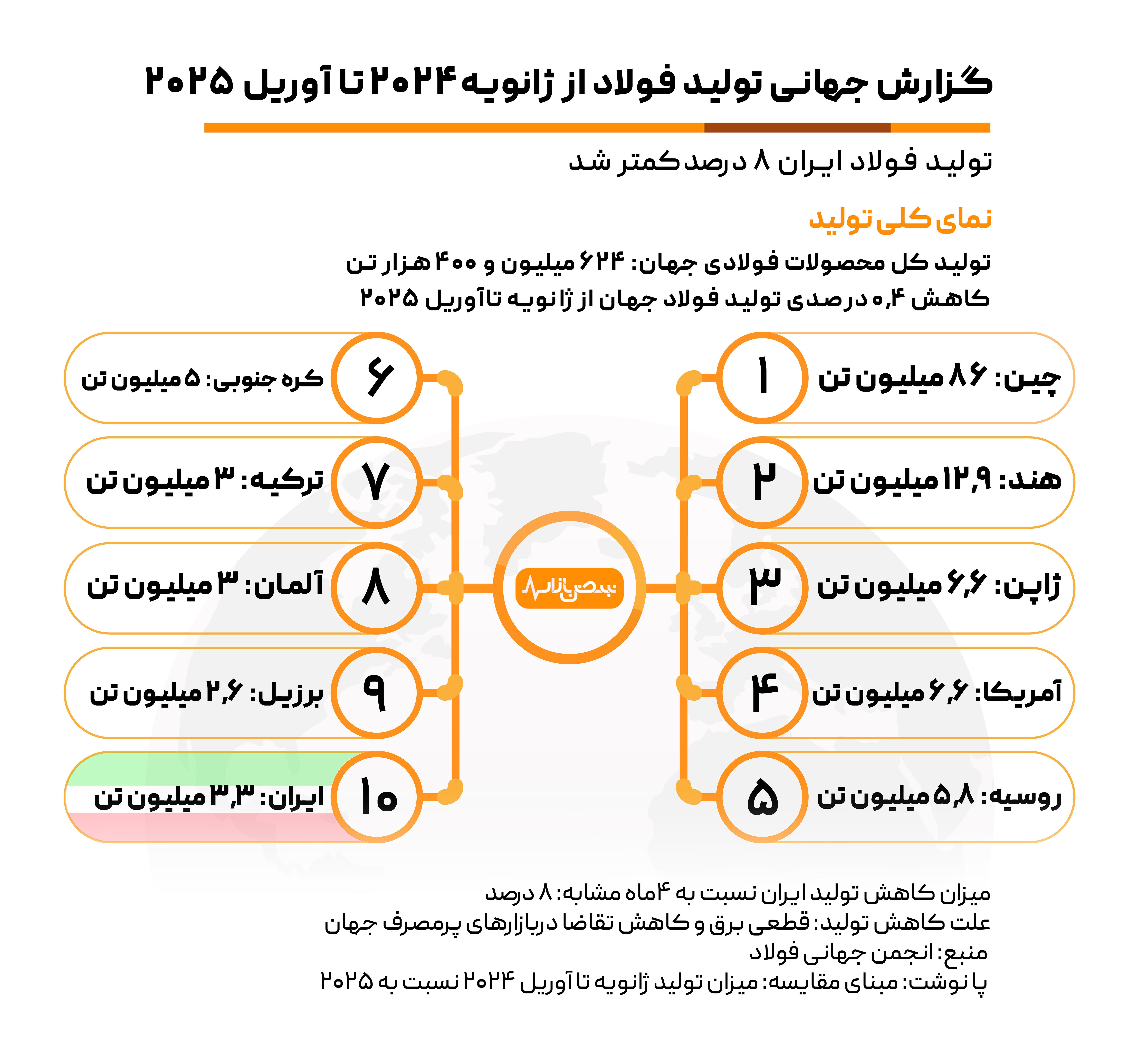 اینفو/ گزارش جهانی تولید فولاد از ژانویه ۲۰۲۴ تا آوریل ۲۰۲۵