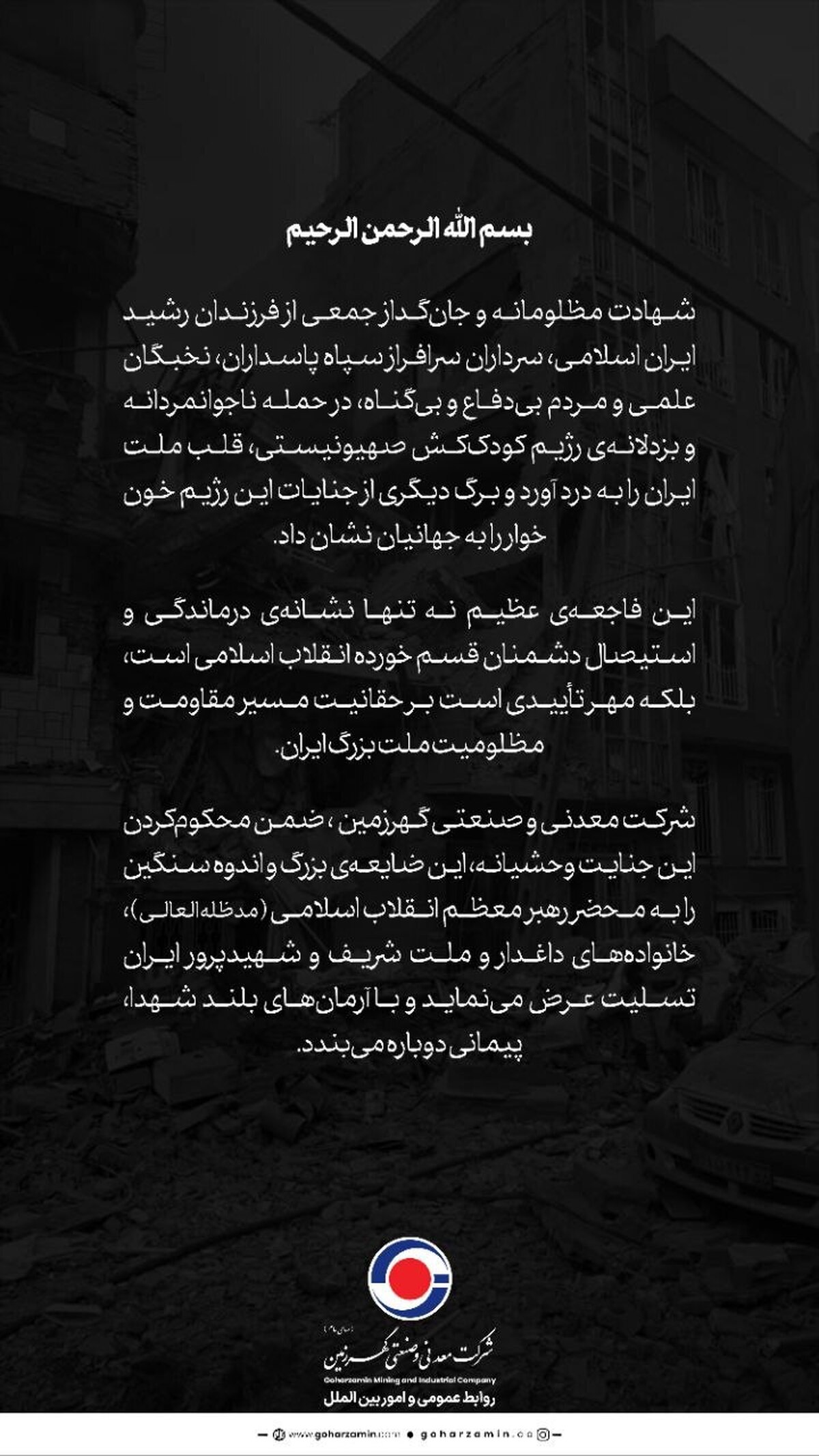 شرکت معدنی و صنعتی گهرزمین ، ضمن محکوم‌کردن این جنایت وحشیانه، این ضایعه‌ی بزرگ و اندوه سنگین را به محضر رهبر معظم انقلاب اسلامی (مدظله‌العالی)، خانواده‌های داغدار و ملت شریف و شهیدپرور ایران تسلیت عرض می‌نماید و با آرمان‌های بلند شهدا، پیمانی دوباره می‌بندد