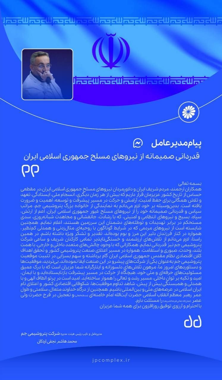 مدیرعامل پتروشیمی جم در پیامی از نیروهای مسلح تقدیر و تشکر کرد محمدهاشم نجفی اردکانی، مدیرعامل و نائب رئیس هیئت مدیره شرکت پتروشیمی جم در پیامی از نیروهای مسلح تقدیر و تشکر کرد. متن پیام به شرح زیر است.