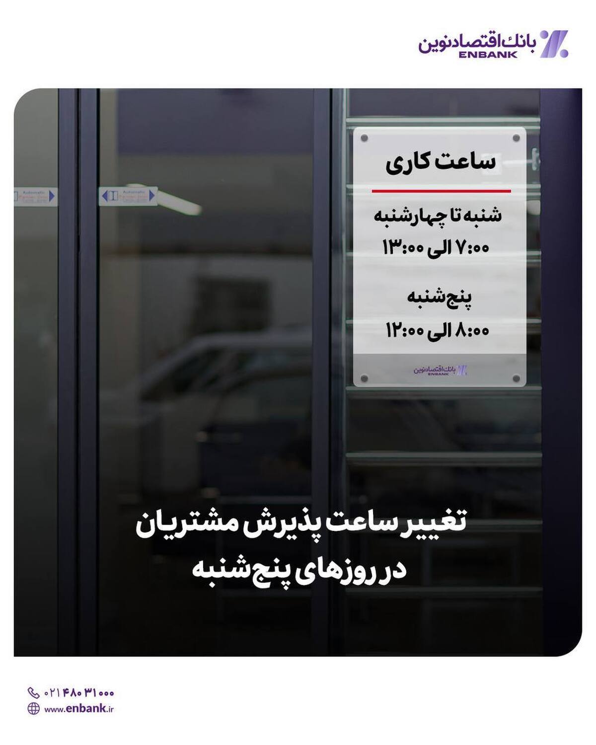تغییر ساعت پذیرش مشتریان بانک اقتصاد نوین در روزهای پنج‌شنبه