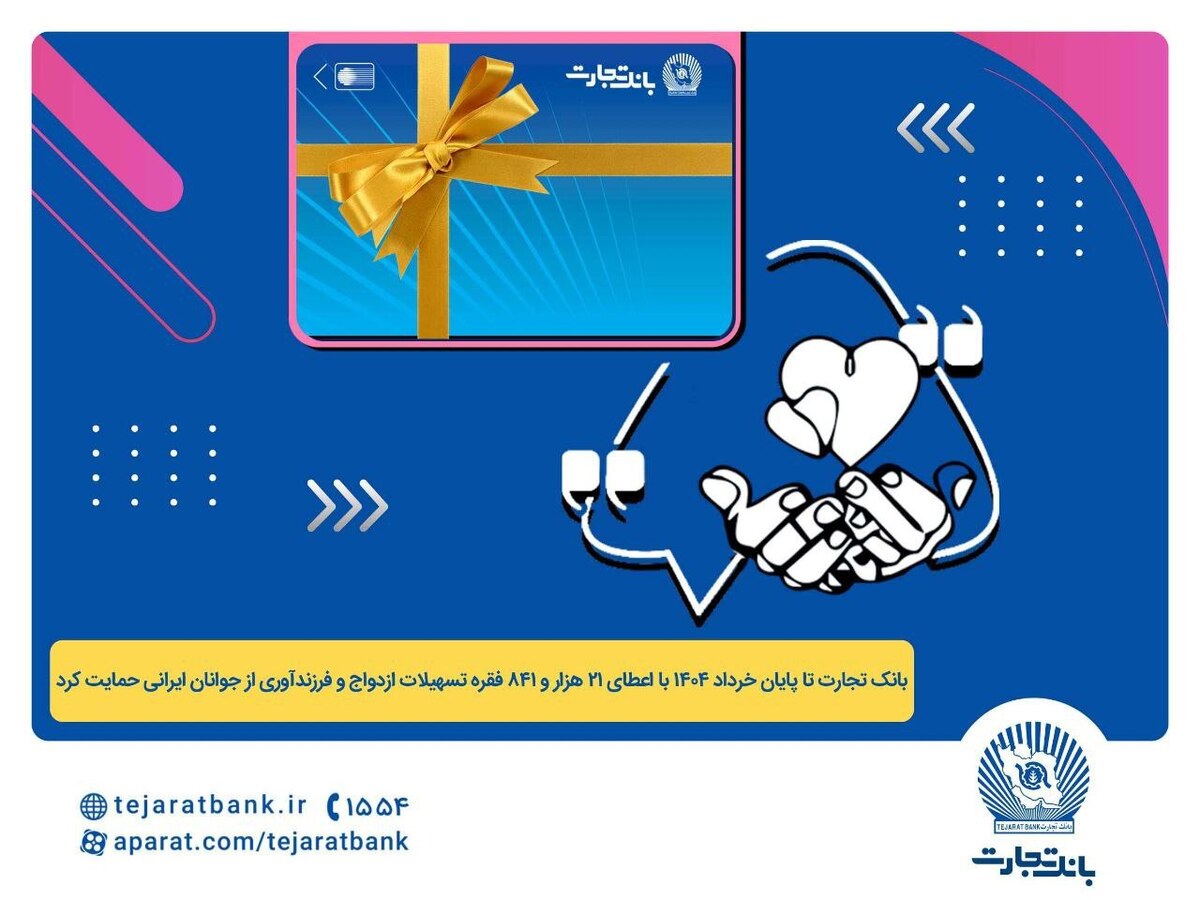 بانک تجارت در راستای حمایت از جوانان و خانوادههای ایرانی و در تداوم رویکرد ترویج سنت حسنه ازدواج، تا پایان خرداد ۱۴۰۴ تعداد ۲۱ هزار و ۸۴۱ فقره جمعا به مبلغ ۴۴ هزار و ۴۴۴ میلیارد ریال تسهیلات ازدواج و فرزندآوری اعطا کرده است.