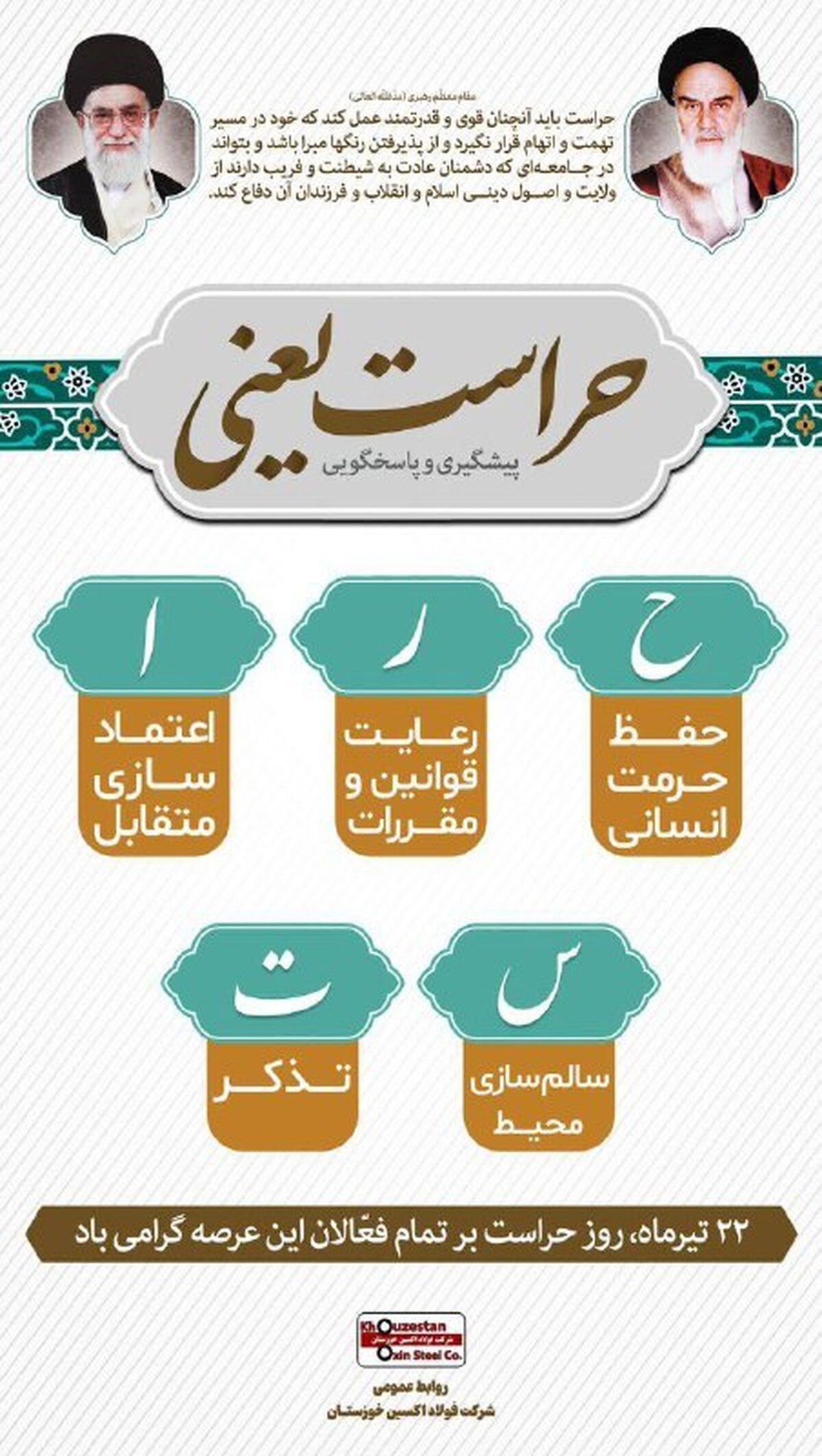 اینجانب ضمن تسلیت ایام سوگواری سالار شهیدان حضرت اباعبدالله الحسین (ع) و یاران باوفایش، فرارسیدن روز حراست را به همه‌ی همکاران شریف و خدوم این حوزه، به‌ویژه عزیزان پرتلاشم در شرکت فولاد اکسین خوزستان تبریک عرض می‌کنم و امیدوارم با توکل بر خداوند متعال، در مسیر ارتقای جایگاه این نهاد مهم و اثرگذار، بیش از پیش موفق باشید.