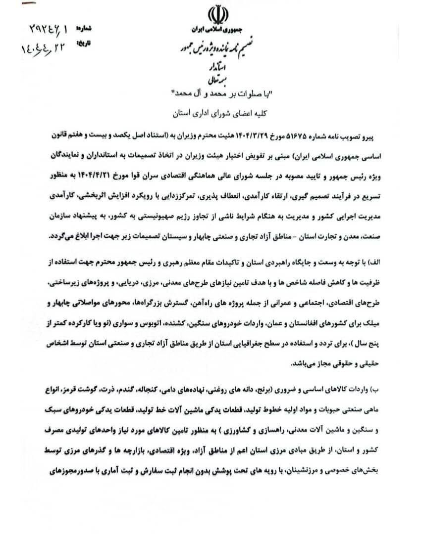 منصور بیجار، استاندار سیستان و بلوچستان، در نامهای مورخ ۲۲ تیر ماه به اعضای شورای اداری استان از افزایش قدرت استاندار و مجوز لازم برای واردات صحبت میکند. در بخشی از متن نامه آمده است: «واردات کالاهای اساسی و ضروری برنج دانههای روغنی نهادههای دامی کنجاله گندم ذرت، گوشت قرمز، انواع ماهی صنعتی حبوبات و مواد اولیه خطوط تولید قطعات یدکی ماشین آلات خط تولید قطعات یدکی خودروهای سبک و سنگین و ماشین آلات معدنی راهسازی و کشاورزی به منظور تأمین کالاهای مورد نیاز واحدهای تولیدی مصرف کشور و استان از طریق مبادی مرزی استان اعم از مناطق آزاد ویژه اقتصادی بازارچهها و گذرهای مرزی توسط بخشهای خصوصی و مرزنشینان با رویههای تحت پوشش بدون انجام ثبت سفارش و ثبت آماری با صدور مجوزهای شماره ۹۲۴۶۱ جمهوری اسلامی ایران تعامل بهداشتی، قرنطینهای استاندارد انجام و گمرک جهت شفافیت میزان واردات و نوع و ارزش کالاهای وارداتی را کنترل و اطلاعات آماری مربوطه با رعایت قوانین و مقررات و پرداخت عوارض قانونی و مالیات صورت پذیرد.»