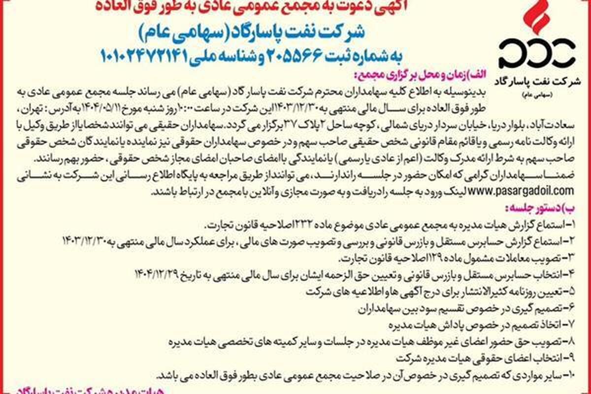 بدینوسیله به اطلاع کلیه سهامداران محترم شرکت نفت پاسارگاد (سهامی عام) میرساند جلسه مجمع عمومی عادی به طور فوق العاده برای سال مالی منتهی به ۳۰/۱۲/۱۴۰۳ این شرکت در ساعت ۱۰:۰۰ روز شنبه مورخ ۱۱/۰۵/۱۴۰۴ به آدرس تهران، سعادت آباد، بلوار دریا، خیابان سردار دریای شمالی، کوچه ساحل ۲ پلاک ۳۷ برگزار میگردد. سهامداران حقیقی میتوانند شخصا یا از طریق وکیل با ارائه وکالت نامه رسمی و یا قائم مقام قانونی شخص حقیقی صاحب سهم و در خصوص سهامداران حقوقی نیز نماینده یا نمایندگان شخص حقوقی صاحب سهم به شرط ارائه مدرک وکالت (اعم از عادی یا رسمی) یا نمایندگی با امضای صاحبان امضای مجاز شخص حقوقی، حضور بهم رسانند.