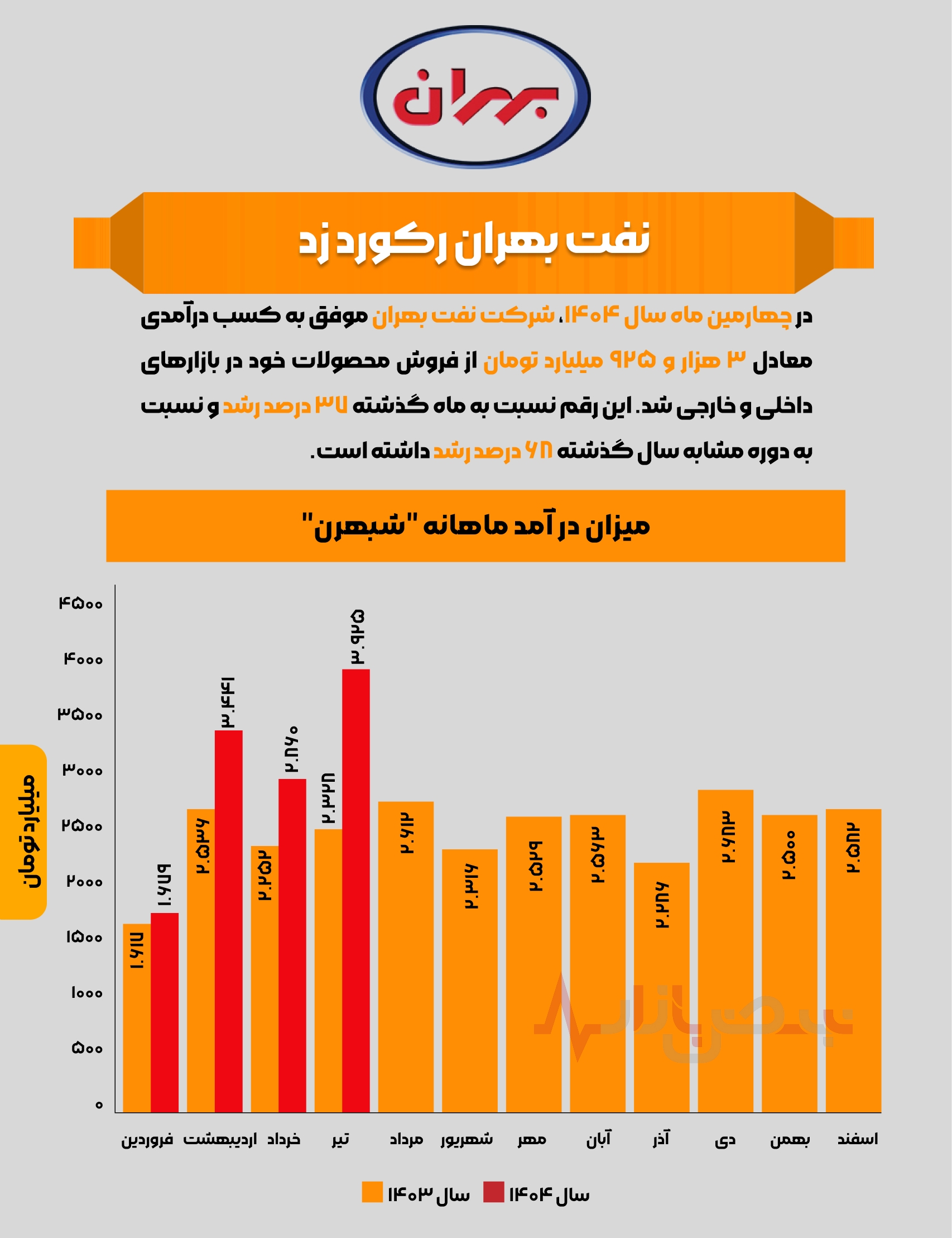 در چهارمین ماه سال ۱۴۰۴، شرکت نفت بهران موفق به کسب درآمدی معادل ۳ هزار و ۹۲۵ میلیارد تومان از فروش محصولات خود در بازارهای داخلی و خارجی شد. این رقم نسبت به ماه گذشته ۳۷ درصد رشد و نسبت به دوره مشابه سال گذشته ۶۸ درصد رشد داشته است.