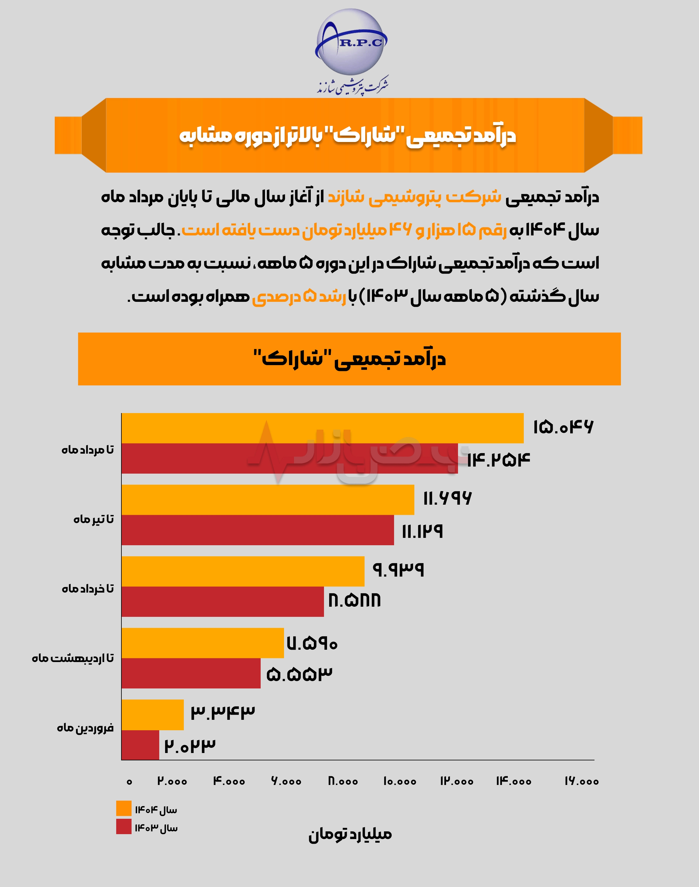 درآمد تجمیعی شرکت پتروشیمی شازند از آغاز سال مالی تا پایان مرداد ماه سال ۱۴۰۴ به رقم ۱۵ هزار و ۴۶ میلیارد تومان دست یافته است. جالب توجه است که درآمد تجمیعی شاراک در این دوره ۵ ماهه، نسبت به مدت مشابه سال گذشته (۵ ماهه سال ۱۴۰۳) با رشد ۵ درصدی همراه بوده است.