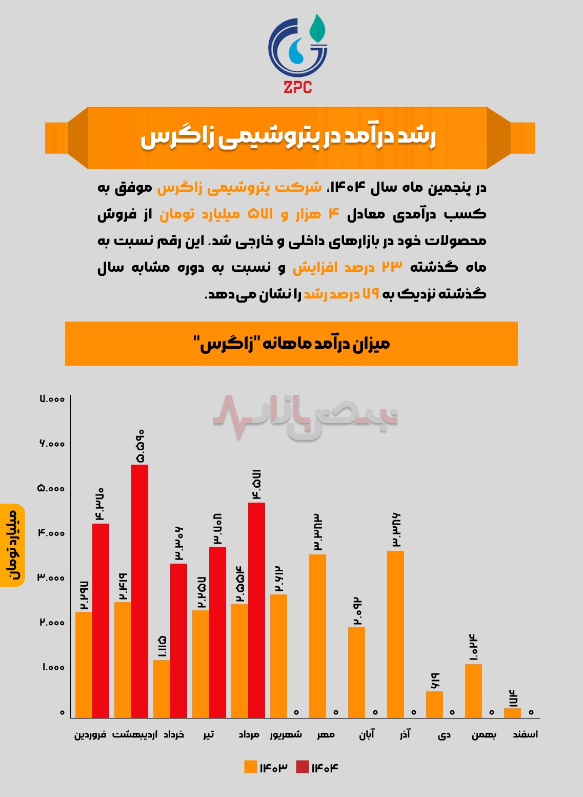 در پنجمین ماه سال ۱۴۰۴، شرکت پتروشیمی زاگرس موفق به کسب درآمدی معادل ۴ هزار و ۵۷۱ میلیارد تومان از فروش محصولات خود در بازارهای داخلی و خارجی شد. این رقم نسبت به ماه گذشته ۲۳ درصد افزایش و نسبت به دوره مشابه سال گذشته نزدیک به ۷۹ درصد رشد را نشان میدهد.