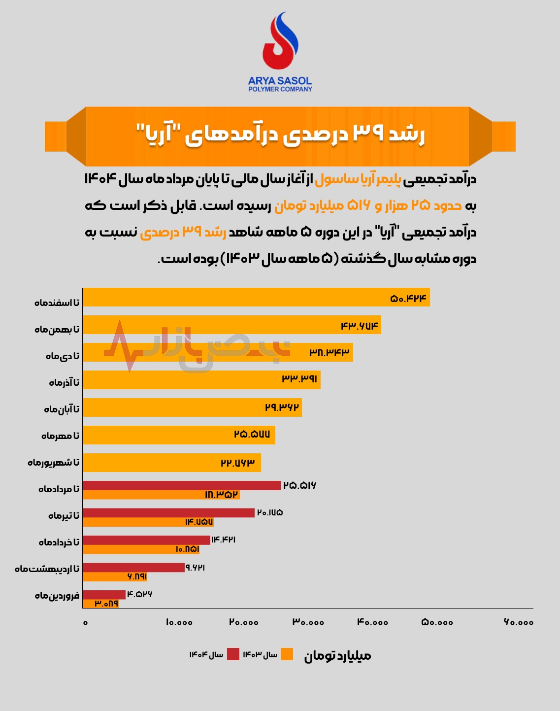 درآمد تجمیعی پلیمر آریا ساسول از آغاز سال مالی تا پایان مرداد ماه سال ۱۴۰۴ به حدود ۲۵ هزار و ۵۱۶ میلیارد تومان رسیده است. قابل ذکر است که درآمد تجمیعی "آریا" در این دوره ۵ ماهه شاهد رشد ۳۹ درصدی نسبت به دوره مشابه سال گذشته (۵ ماهه سال ۱۴۰۳) بوده است.
