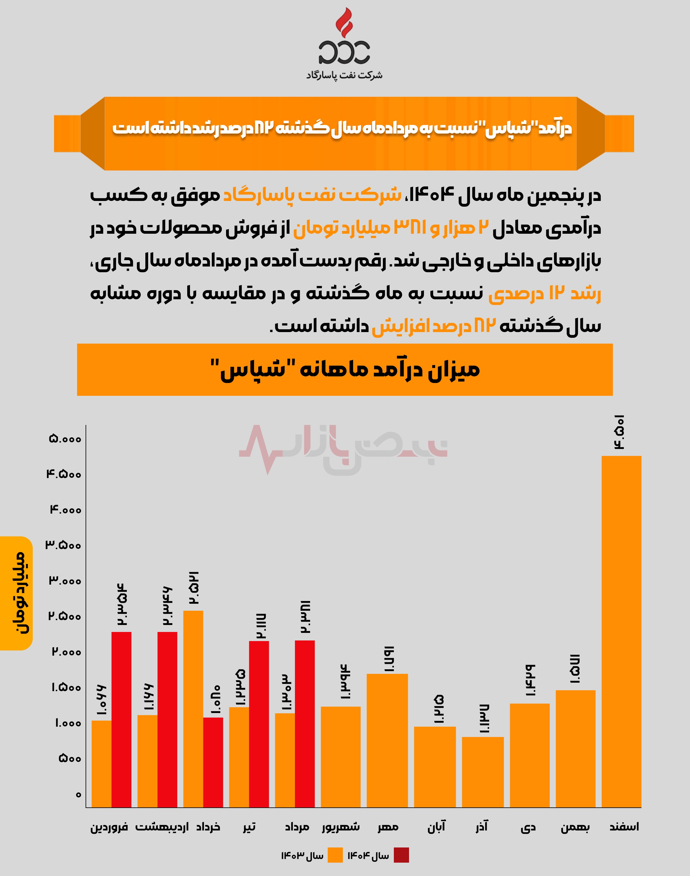 در پنجمین ماه سال ۱۴۰۴، شرکت نفت پاسارگاد موفق به کسب درآمدی معادل ۲ هزار و ۳۸۱ میلیارد تومان از فروش محصولات خود در بازار‌های داخلی و خارجی شد. رقم بدست آمده در مردادماه سال جاری، رشد ۱۲ درصدی نسبت به ماه گذشته و در مقایسه با دوره مشابه سال گذشته ۸۲ درصد افزایش داشته است.