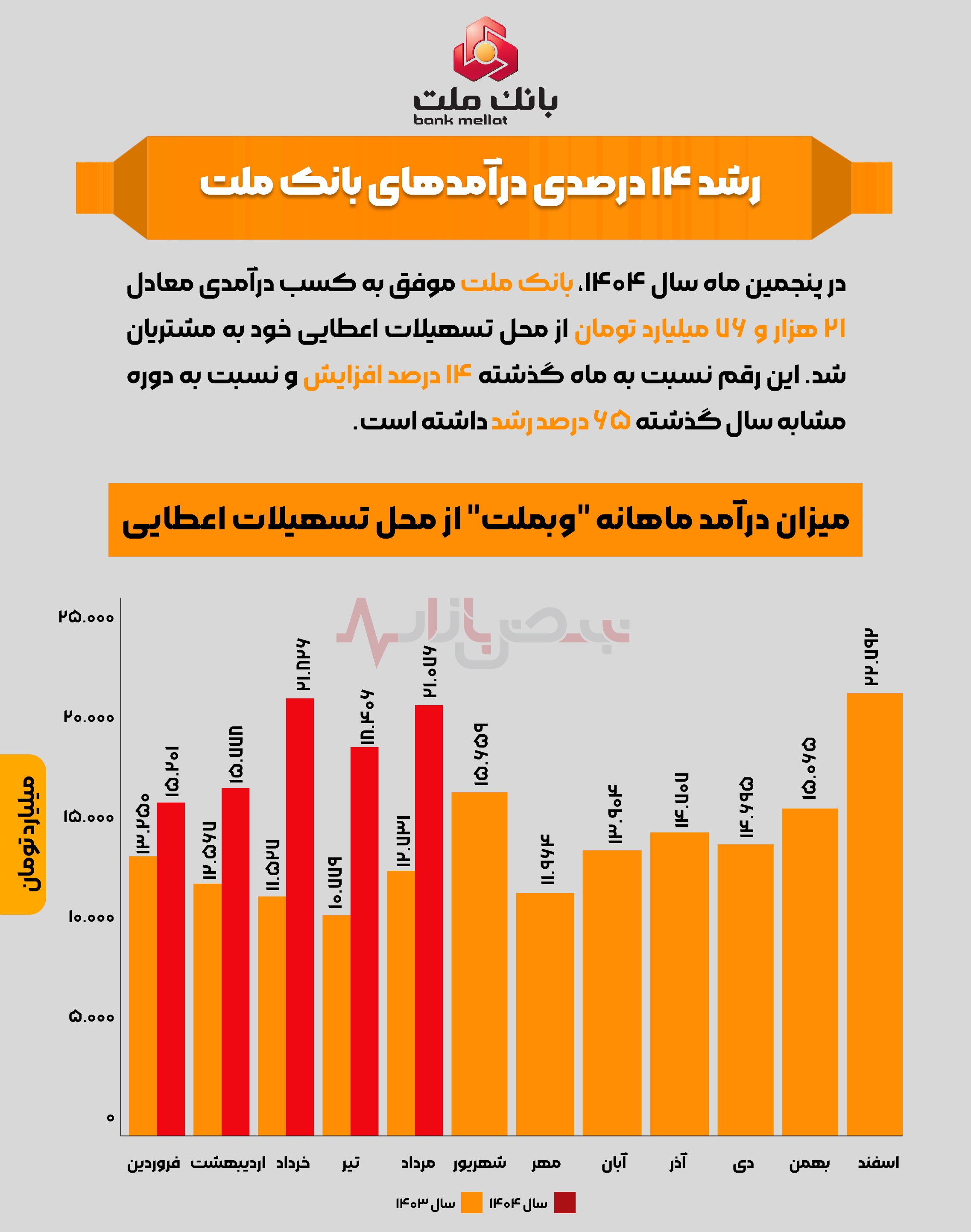 در پنجمین ماه سال ۱۴۰۴، بانک ملت موفق به کسب درآمدی معادل ۲۱ هزار و ۷۶ میلیارد تومان از محل تسهیلات اعطایی خود به مشتریان شد. این رقم نسبت به ماه گذشته ۱۴ درصد افزایش و نسبت به دوره مشابه سال گذشته ۶۵ درصد رشد داشته است.