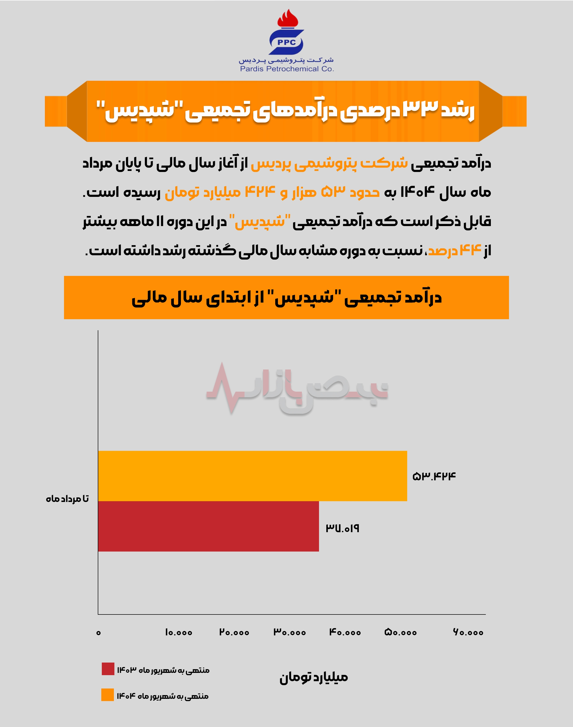 درآمد تجمیعی شرکت پتروشیمی پردیس از آغاز سال مالی تا پایان مرداد ماه سال ۱۴۰۴ به حدود ۵۳ هزار و ۴۲۴ میلیارد تومان رسیده است. قابل ذکر است که درآمد تجمیعی "شپدیس" در این دوره ۱۱ ماهه بیشتر از ۴۴ درصد، نسبت به دوره مشابه سال مالی گذشته رشد داشته است.