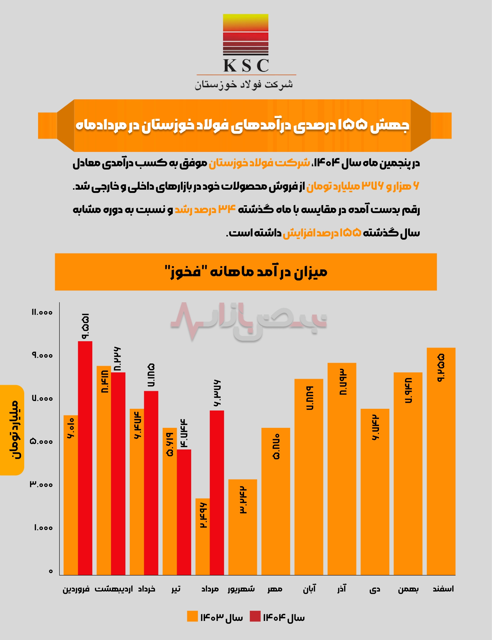 در پنجمین ماه سال ۱۴۰۴، شرکت فولاد خوزستان موفق به کسب درآمدی معادل ۶ هزار و ۳۷۶ میلیارد تومان از فروش محصولات خود در بازارهای داخلی و خارجی شد. رقم بدست آمده در مقایسه با ماه گذشته ۳۴ درصد رشد و نسبت به دوره مشابه سال گذشته ۱۵۵ درصد افزایش داشته است.