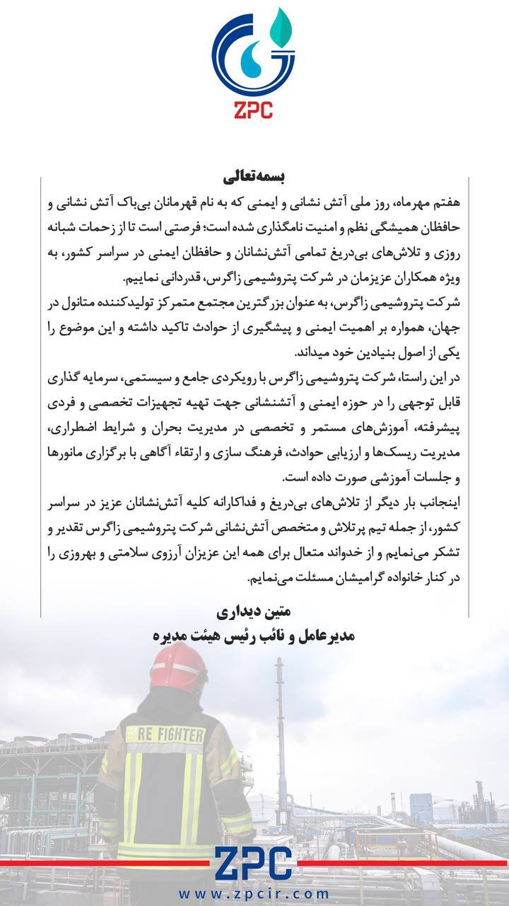 پیام تبریک مدیرعامل پتروشیمی زاگرس به مناسبت روز ملی آتشنشانی متین دیداری مدیرعامل و نائب رئیس هیئت مدیره شرکت پتروشیمی زاگرس به مناسبت روز ملی آتشنشانی و ایمنی پیام تبریکی صادر کرد.