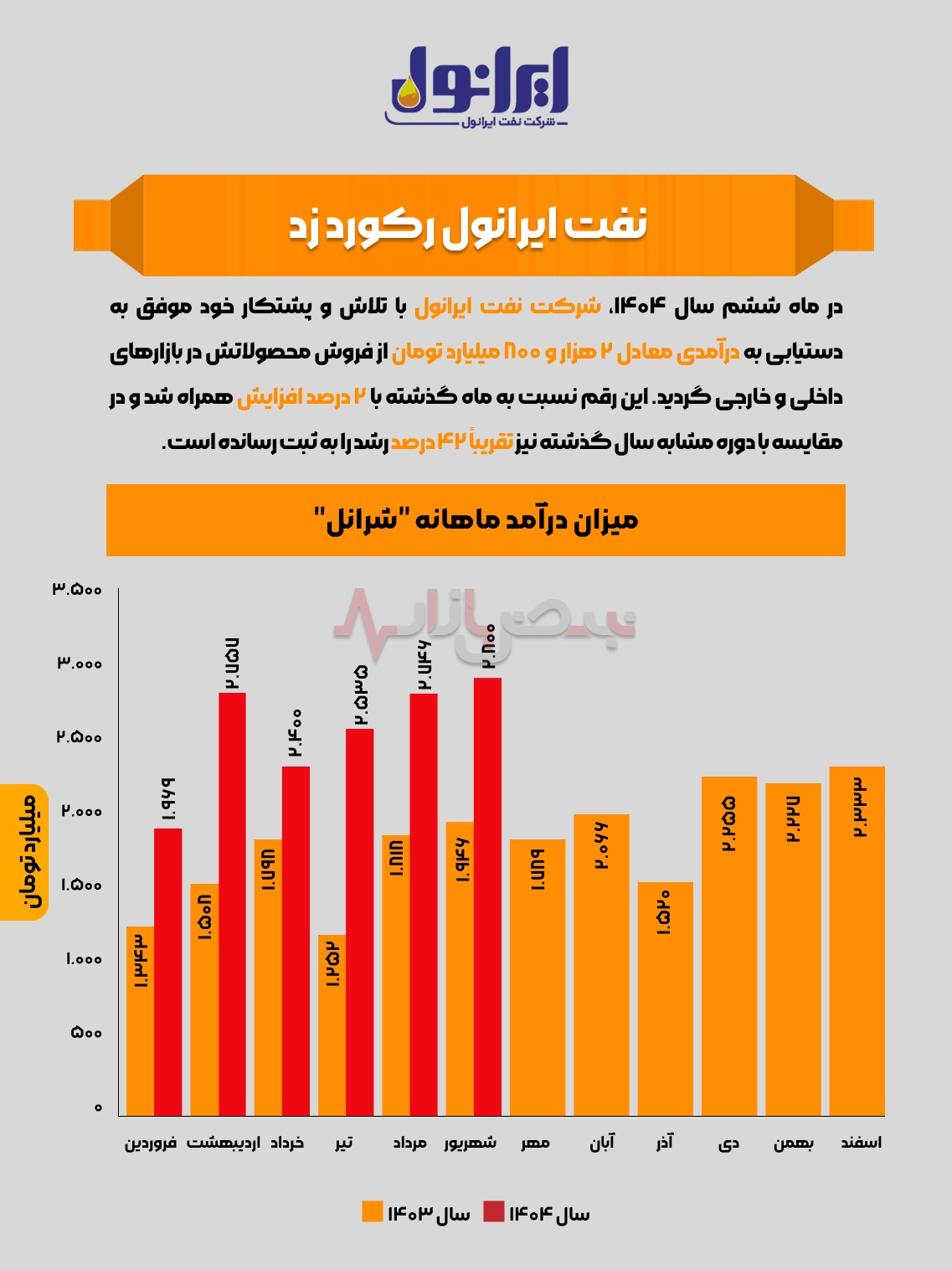 در ماه ششم سال ۱۴۰۴، شرکت نفت ایرانول با تلاش و پشتکار خود موفق به دستیابی به درآمدی معادل ۲ هزار و ۸۰۰ میلیارد تومان از فروش محصولاتش در بازار‌های داخلی و خارجی گردید. این رقم نسبت به ماه گذشته با ۲ درصد افزایش همراه شد و در مقایسه با دوره مشابه سال گذشته نیز تقریباً ۴۲ درصد رشد را به ثبت رسانده است.
