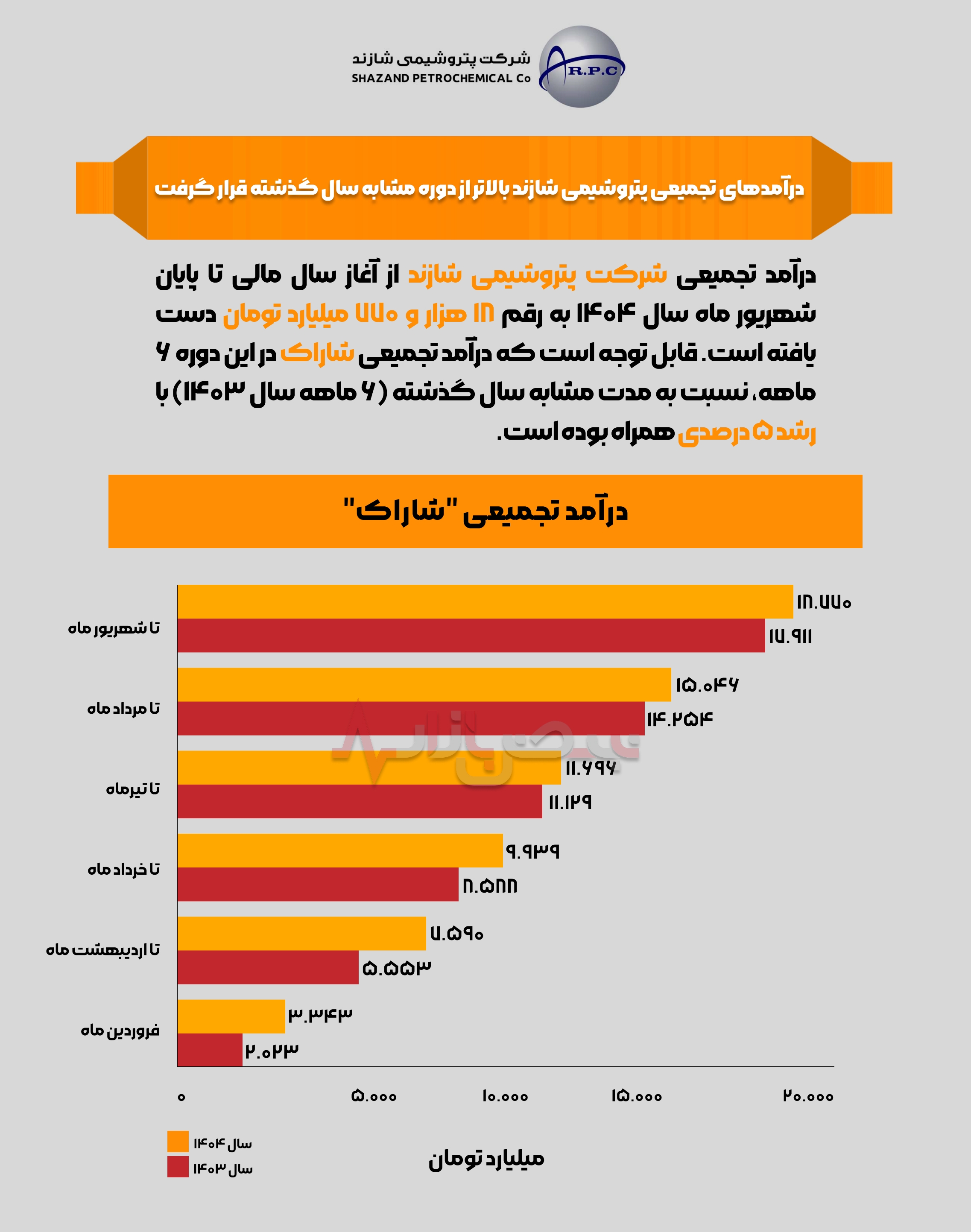 درآمد تجمیعی شرکت پتروشیمی شازند از آغاز سال مالی تا پایان شهریور ماه سال ۱۴۰۴ به رقم ۱۸ هزار و ۷۷۰ میلیارد تومان دست یافته است. قابل توجه است که درآمد تجمیعی شاراک در این دوره ۶ ماهه، نسبت به مدت مشابه سال گذشته (۶ ماهه سال ۱۴۰۳) با رشد ۵ درصدی همراه بوده است.