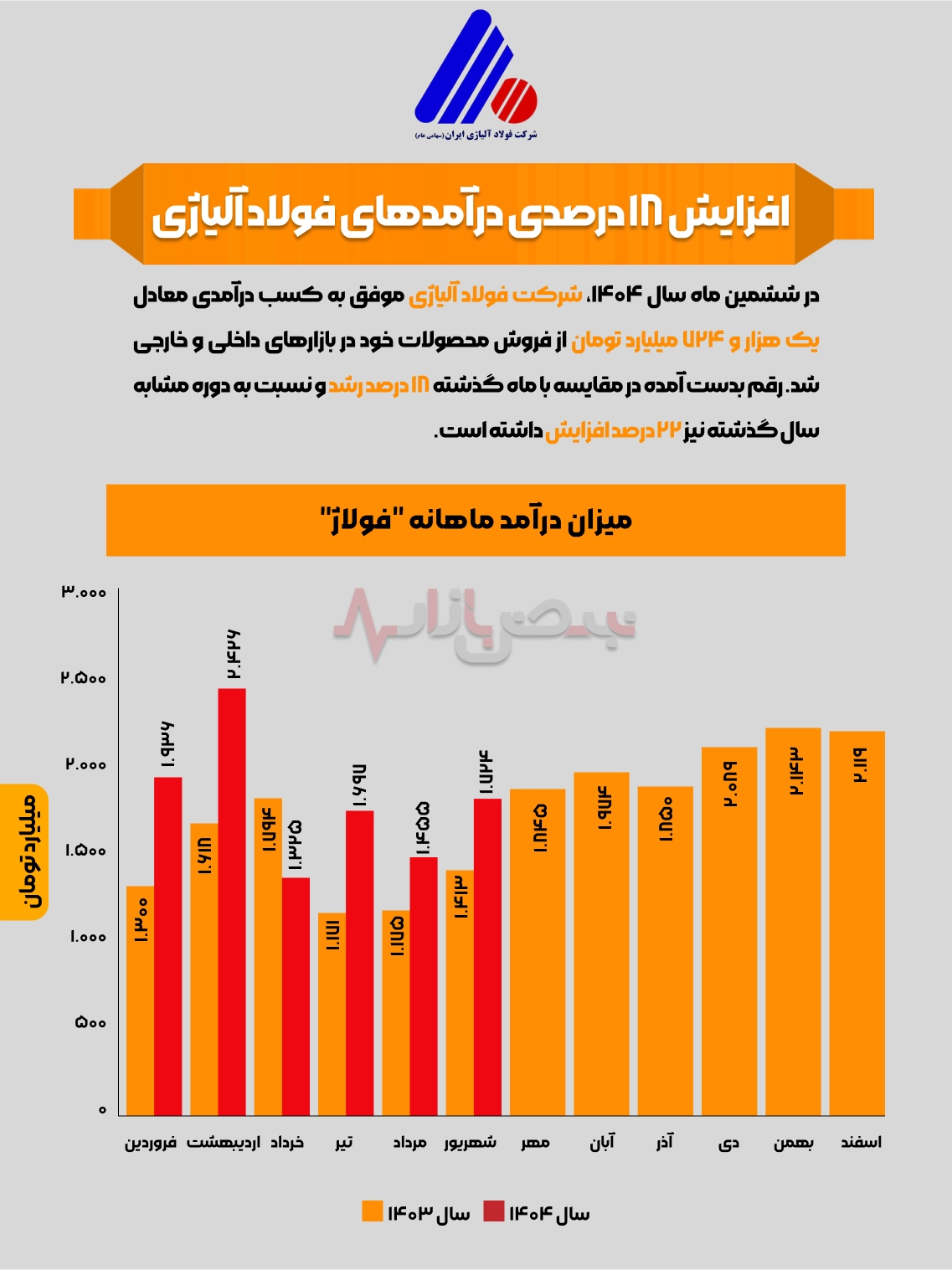 در ششمین ماه سال ۱۴۰۴، شرکت فولاد آلیاژی موفق به کسب درآمدی معادل یک هزار و ۷۲۴ میلیارد تومان از فروش محصولات خود در بازارهای داخلی و خارجی شد. رقم بدست آمده در مقایسه با ماه گذشته ۱۸ درصد رشد و نسبت به دوره مشابه سال گذشته نیز ۲۲ درصد افزایش داشته است.
