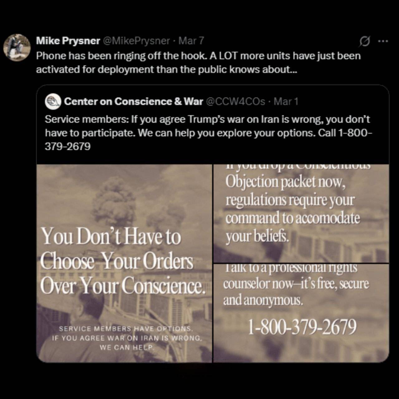 مدیر سازمان آمریکایی حامی سربازان مخالف جنگ اعلام کرد خط تلفن کمک به نظامیانی که می‌خواهند از مشارکت در جنگ با ایران خودداری کنند، بی‌وقفه در حال دریافت تماس است و تعداد واحدهای فعال‌شده برای استقرار، بسیار بیشتر از آن چیزی است که عموم مردم از آن خبر دارند و این موضوع نگرانی و تماس‌های گسترده سربازان را به دنبال داشته است.