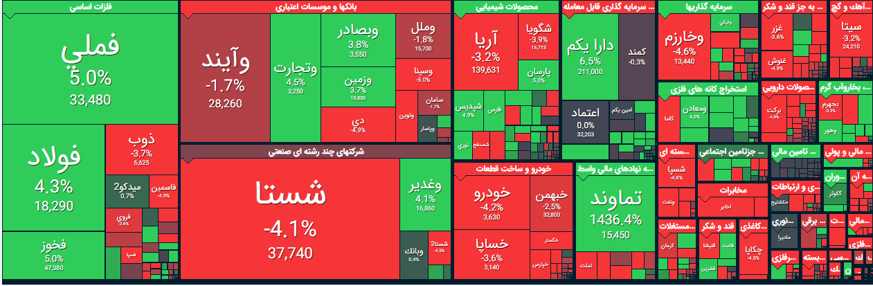 در بازار امروز نمادهای فملی، فولاد و فارس به ترتیب با 4397، 4214 و 3170 بیشترین تاثیر مثبت و نماد شستا با 2496 بیشترین تاثیر منفی را بر روند شاخص کل بازار داشتند.