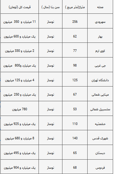 قیمت آپارتمان تازه ساخت در نقاط مختلف پایتخت