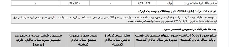 طبق صورت مالی 6 ماهه، این شرکت بیمه‌ای  این شرکت در وضعیت مطلوبی به سر می‌برد چرا که به گواه آمار موجود و بر طبق پارامتر سود انباشته توانسته مقدارسودانباشته خود را از 66 میلیارد تومان به 919 میلیارد تومان برساند و این بعنی رشد خارق العاده و بیش 1270 درصدی، این عدد از آنجا جهت حائز اهمیت است که برآورد هزینه های عمومی این بیمه تا پایان سال نسبت به مدت مشابه سال قبل از 90 میلیارد تومان به 120 میلیارد تومان افزایش پیدا کرده است که کم بودن این افزایش در قبال رشد 1276 درصدی بیانگر عملکرد فوق العاده این شرکت بیمه گذار است.